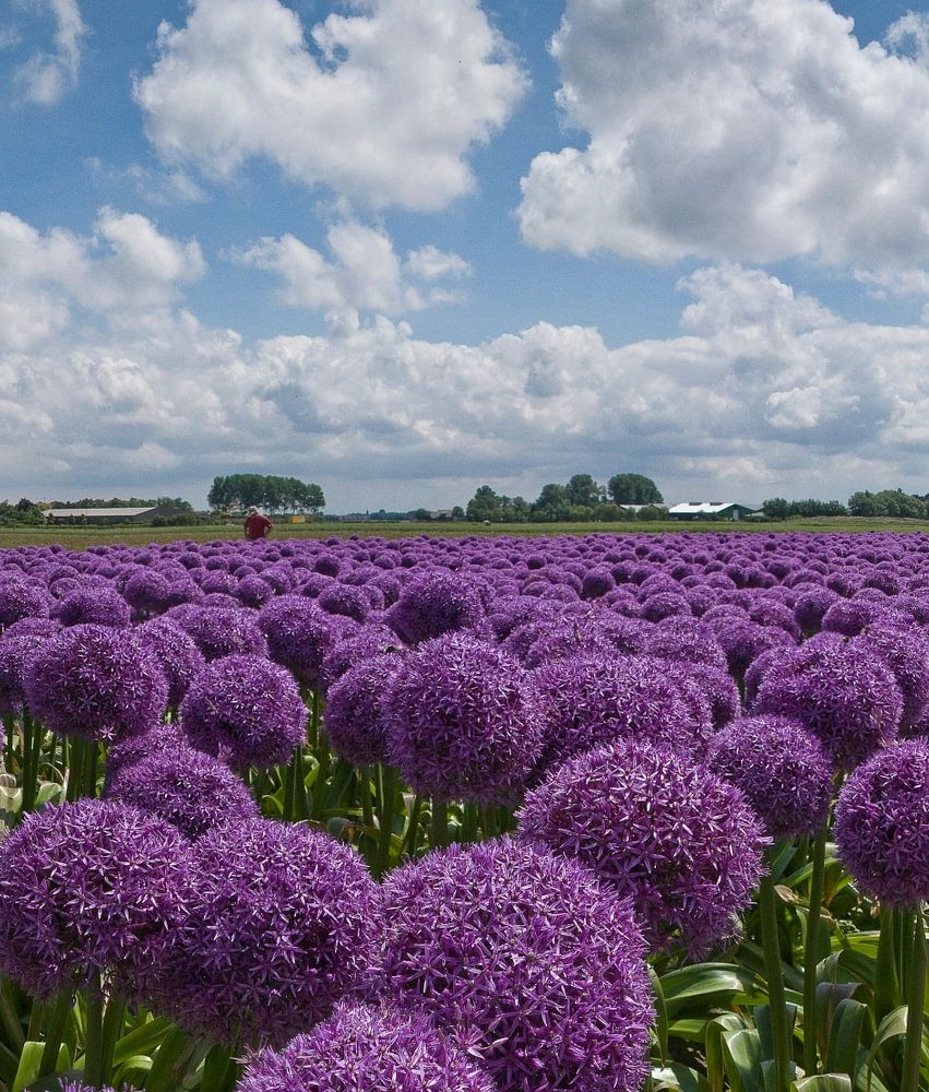 champ de bulbes, violet, nuages, ciel nuageux, bulbe, oignon, allium, fleur, fleurs, printemps,