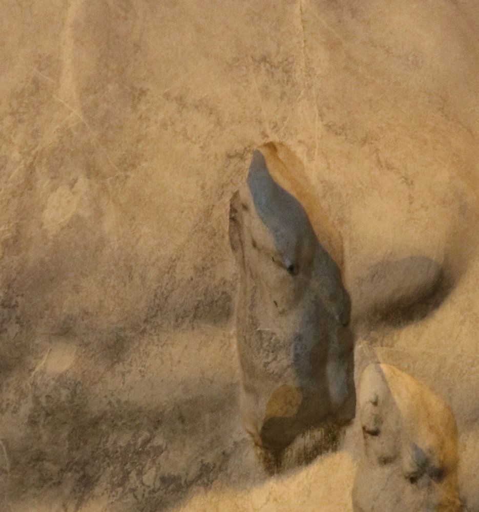Peinture de grotte avec des gnomes et des trolls sur un mur marbré lisse de grotte en blanc crème.