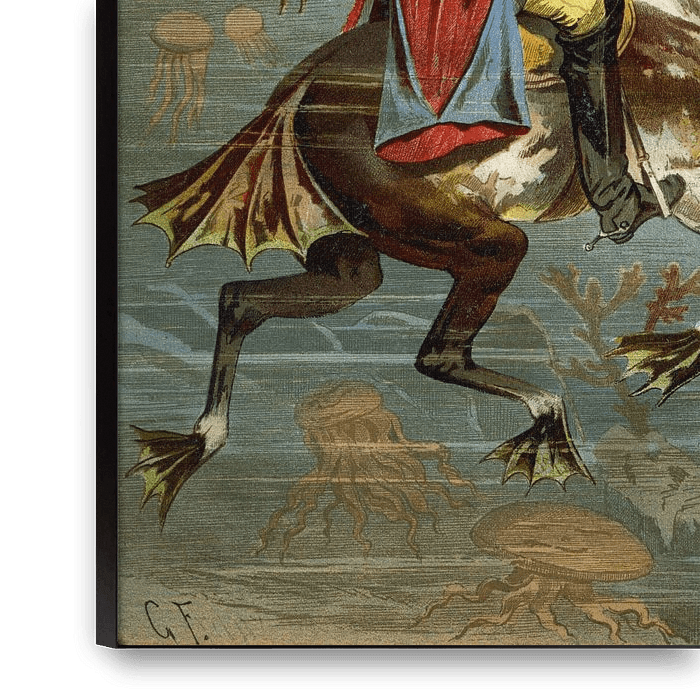 Ici, l'homme à cheval se promène comme un hippocampe parmi les poissons et les monstres sous l'eau.