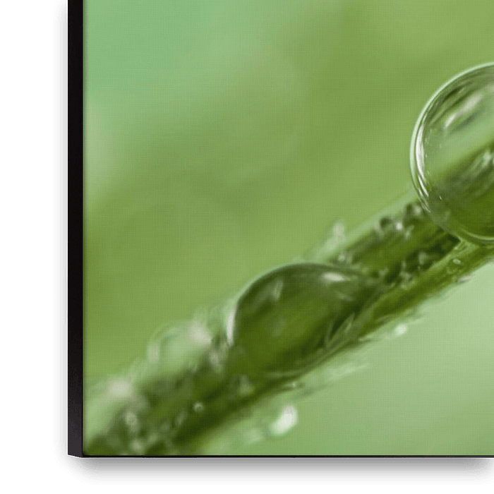 "Drops on a blade&quot ; est une photo macro de minuscules gouttelettes d'eau suspendues (et posées) sur une sorte de brin d'herbe. L'arrière-plan est de couleur sarcelle/turquoise.