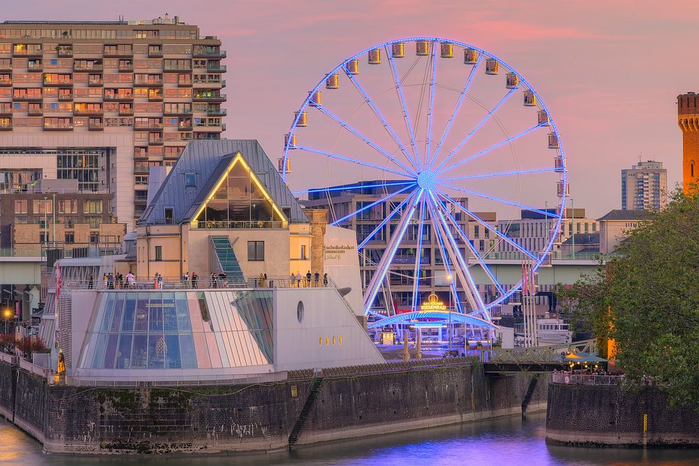 Vue depuis le pont de Deutzer en direction du Rheinauhafen avec les Kranhäuser, le musée du chocolat, la grande roue et la tour Malakoff peu après le coucher du soleil.