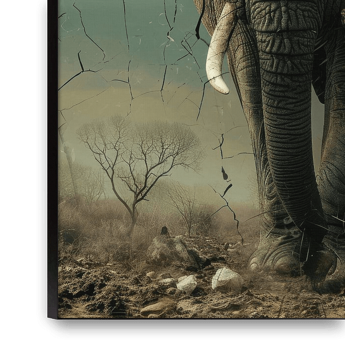 Fragmented Grandeur" montre un éléphant majestueux apparaissant à travers les fractures d'un mur de verre brisé, évoquant une illusion de vulnérabilité et de force dans une nature sauvage et silencieuse. Les profondes rainures de la peau de l'éléphant témoignent de la sagesse et des histoires qu'il porte, tandis que l'environnement…