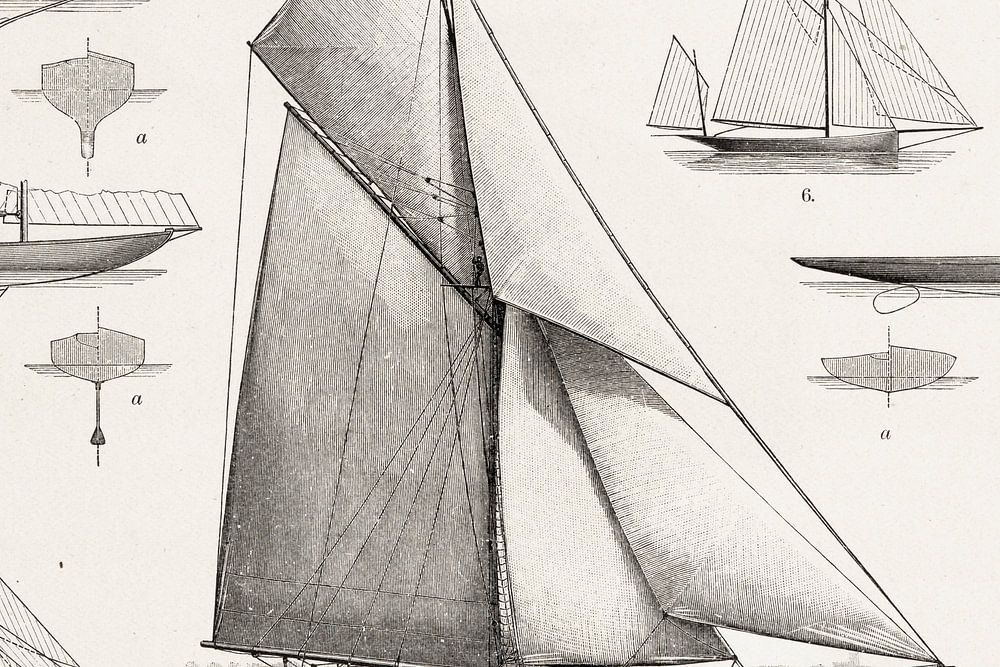 Cette gravure ancienne, datant d'environ 1900, montre un certain nombre de types de voiliers. Il s'agit notamment d'un yacht à quille, d'un yacht à épée, d'un sloop, d'une goélette et d'un jol.