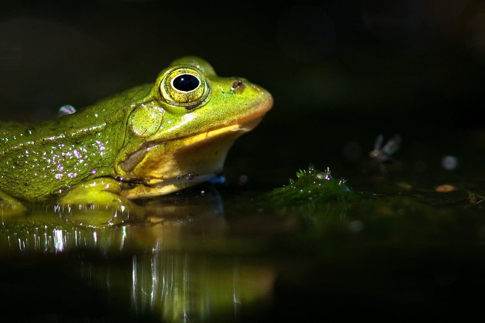Grenouille verte avec reflet dans une piscine sombre avec bokeh