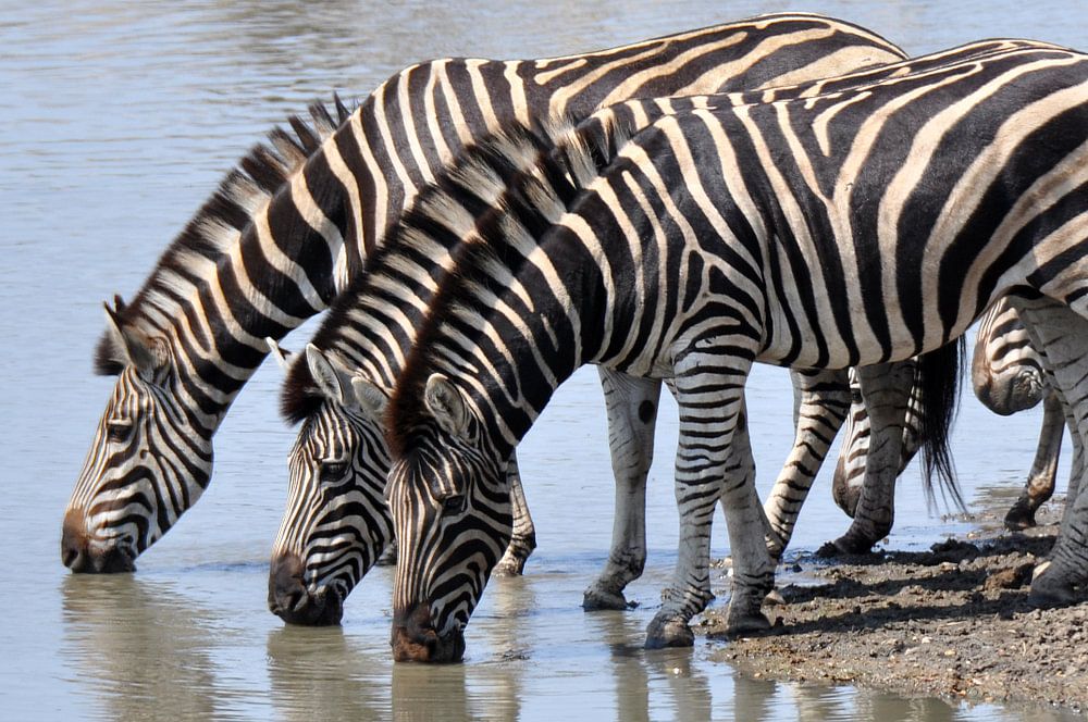 Een groepje zebra's lessen hun dorst bij een waterplaats in het Krugerpark in Zuid Afrika.