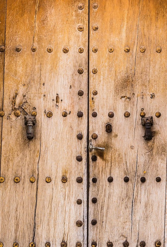 Gros plan d'une porte d'entrée vintage en bois, fond d'entrée de maison par Alex Winter