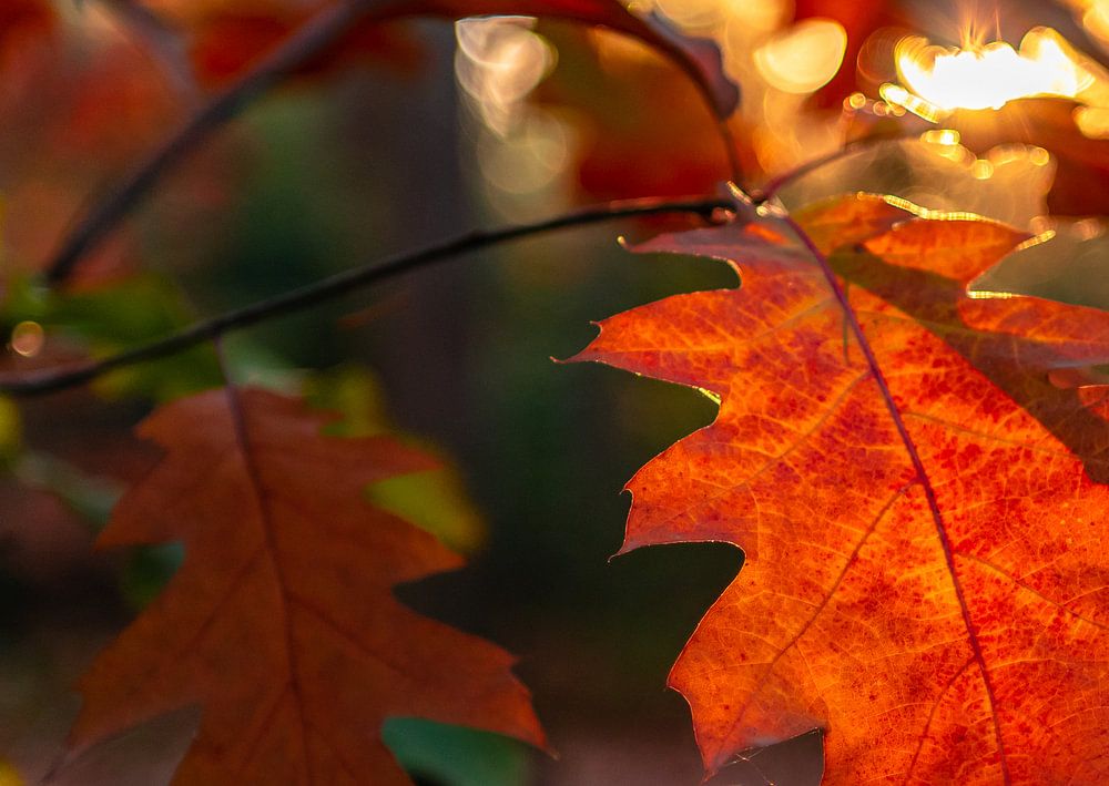 Un gros plan de feuilles automnales rouges avec le bokeh en arrière-plan créé par la lumière du soleil. Les couleurs sont rouge, orange, jaune et vert. La photo a été prise dans le mastos à Breda.