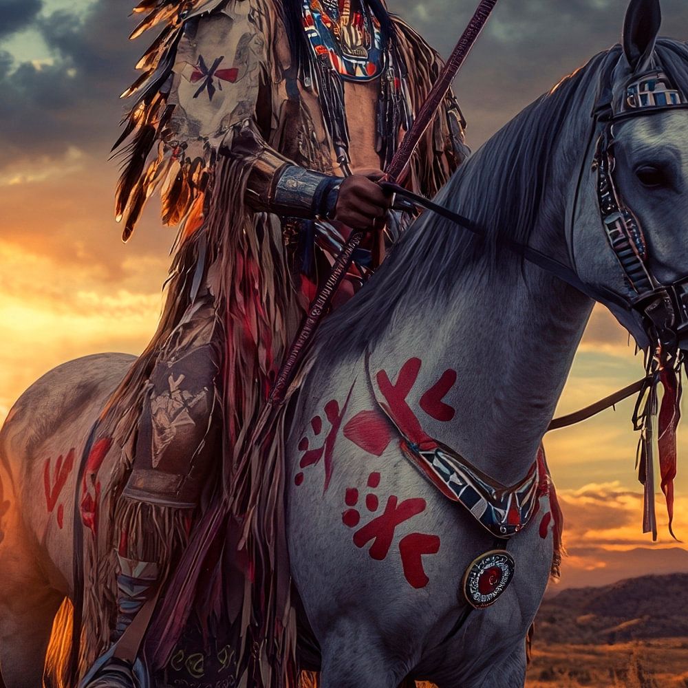 Dans le crépuscule doré, une figure majestueuse se dresse sur un fier cheval, entourée de l'immensité de la prairie. La magnifique coiffure à plumes et les vêtements artistiquement décorés dégagent une tradition profondément enracinée, tandis que la lance est prête à partir à l'aventure. Une image pleine de force, d'histoire et de la beauté intacte de la nature.
