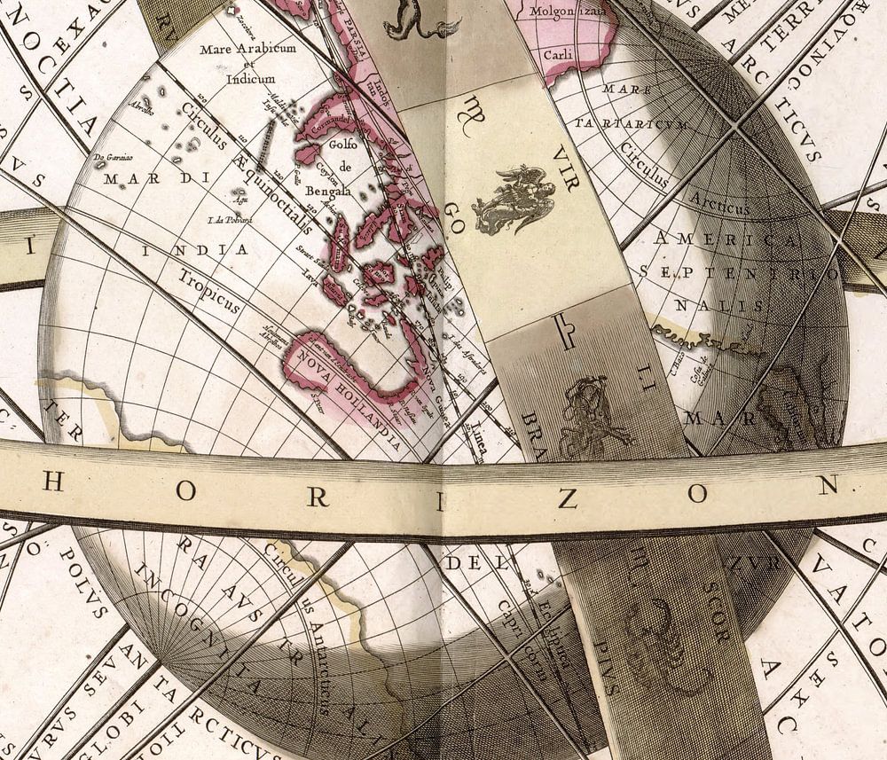 Harmonia macrocosmica, les constellations connues qui entourent le monde connu à l'époque. Une constellation telle que Gémeaux, Cancer, Lion, Vierge, Balance, Scorpion, Sagittaire et Capricorne figure sur l'objet d'art. Sur le globe, on trouve l'Asie du Sud-Est avec l'Indonésie, la Thaïlande, la Malaisie, l'Inde, les Philippines et le Sri Lanka, mais aussi la Nouvelle Hollande ou l'Australie.