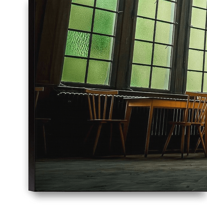 Cette image capture l'architecture et l'atmosphère impressionnantes d'une pièce de l'orphelinat Lenoir. Les hautes fenêtres en forme d'arc laissent entrer une douce lumière qui se réfracte dans les vitres vertes et opaques, créant une ambiance calme, presque sacrée. Les murs en bois massif et le lustre de style suspendu au plafond…