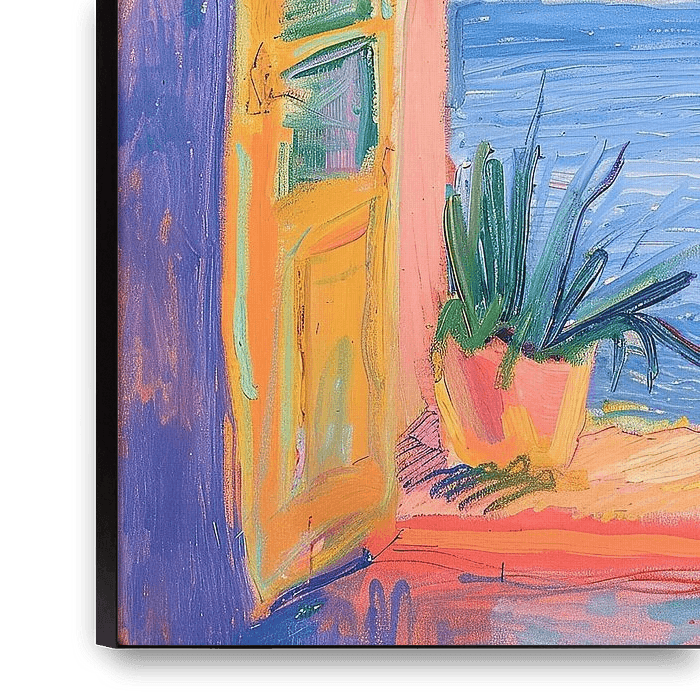 "Open Window&quot ; est une œuvre d'art qui capte l'ambiance lumineuse rayonnante du sud de la France et montre une scène à travers une fenêtre ouverte. Les couleurs intenses et la conception vivante rappellent fortement le style d'Henri Matisse, connu pour son utilisation magistrale des couleurs et des formes claires et simples.