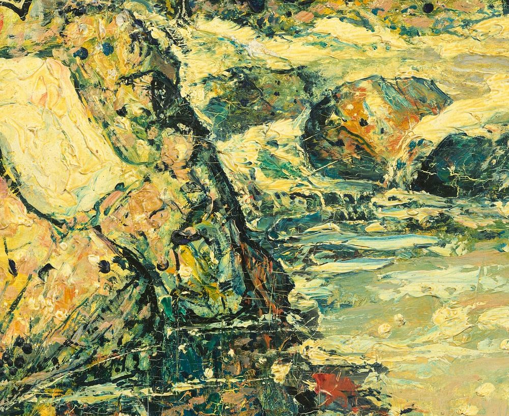 Flecks of Foam" ; de Henry Golden Dearth, peint vers 1912, dépeint un paysage côtier vivant. La peinture est riche en textures et en couleurs, avec un style impressionniste qui capture le dynamisme de la mer et du littoral. Un parasol rouge et blanc est visible au premier plan, offrant de l'ombre sur le rivage rocheux. Les rochers sont couverts de taches colorées et l'écume des vagues éclabousse le rivage. La mer elle-même est un mélange de nuances de vert et de bleu, avec des têtes d'écume blanches suggérant le mouvement de l'eau. Au loin, un littoral est visible sous un ciel légèrement nuageux. Le tableau est intéressant pour ses coups de pinceau expressifs et l'utilisation de la couleur pour capturer l'énergie et la beauté de la nature.