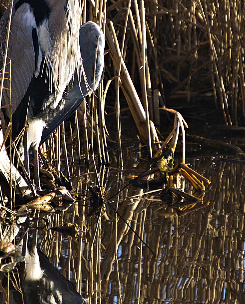 Dans les roseaux qui se reflètent dans l'eau du fossé, le héron se recueille un peu.