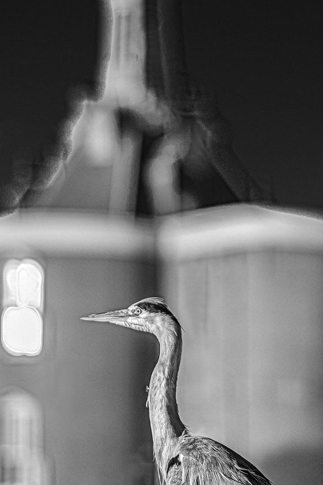 Un héron dans la lumière du matin sur un voilier dans le port de la ville portuaire d'Enkhuizen en Frise occidentale en noir et blanc avec le Dromedaris flou à l'arrière-plan. La profondeur de champ a été délibérément choisie limitée pour mettre l'accent sur le premier plan.