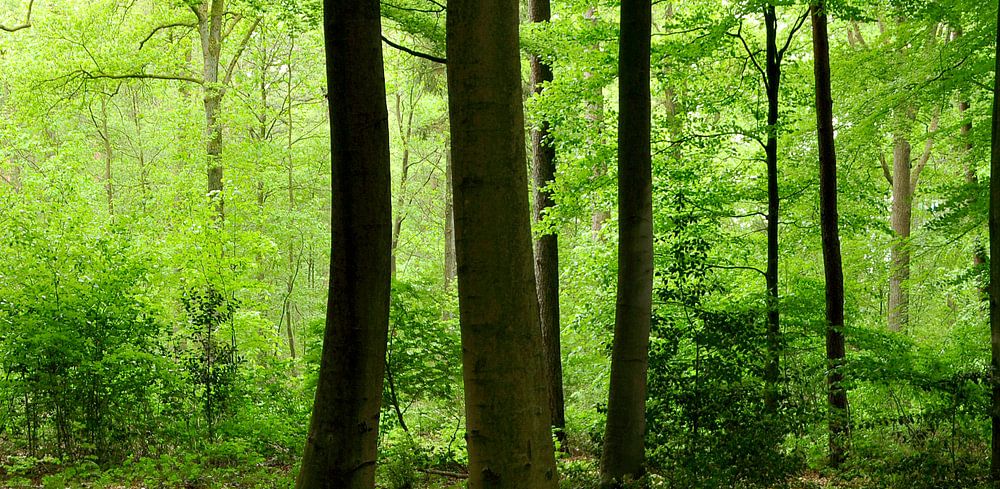 Photo d'une hêtraie au printemps. Les hêtres sont décorés de feuilles vert clair qui viennent d'ouvrir en mai. La lumière en arrière-plan renforce le vert des feuilles sur les arbres et les arbustes.