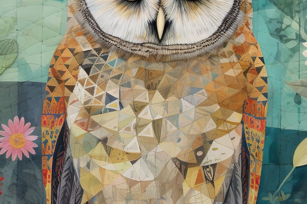 Hibou géométrique | Œuvre d'art hibou - Cette œuvre d'art captivante montre un hibou assis sur une branche au milieu d'une abondance de fleurs et de flore. Le hibou lui-même est composé de motifs géométriques qui contrastent de manière ludique avec le fond pittoresque, presque semblable à une aquarelle. Les nuances de verdure, associées aux fleurs de couleur terracotta et pastel, lui confèrent un aspect à la fois naturel et stylisé.