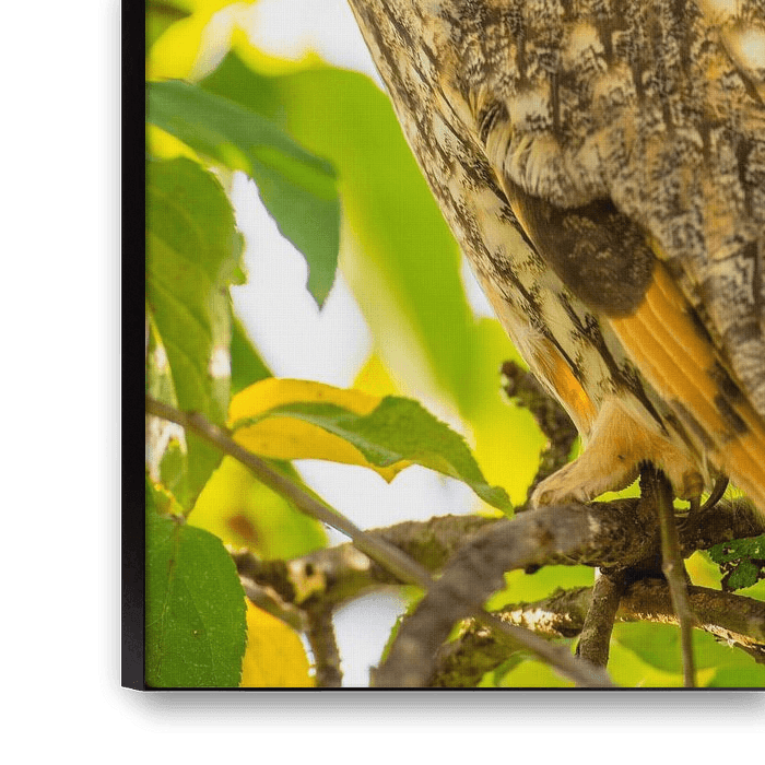 Hibou moyen-duc (Asio otus) assis en haut d'un pommier aux feuilles vertes lors d'une journée d'automne.