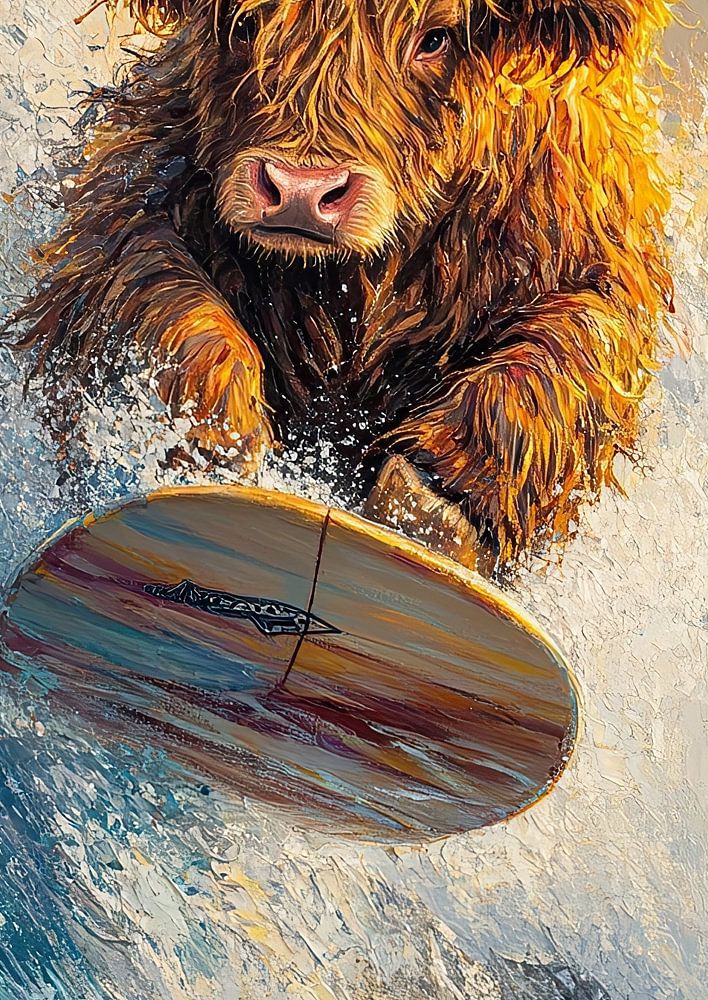 La vache Highland sur une planche de surf est une représentation à la fois humoristique et profonde de la créativité et de l'individualité. Elle combine la nature robuste d'une vache avec la liberté du surf et nous incite à penser en dehors des sentiers battus. Cette combinaison nous incite à regarder le monde avec curiosité et ouverture d'esprit. Elle montre qu'il n'y a pas de règles fixes et que nous pouvons tous façonner notre vie à notre manière. La vache sur la planche de surf nous rappelle que le courage et l'humour sont les meilleurs compagnons sur le chemin des idées nouvelles.