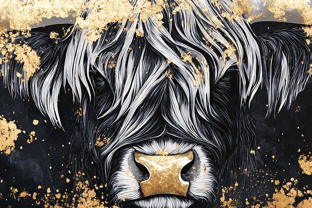 Cette œuvre d'art numérique saisissante montre un impressionnant Highlander écossais sur un fond noir, décoré d'accents dorés. Les cornes et la fourrure du Highlander sont soulignées par des détails subtils mais puissants en blanc et en or, créant un fort contraste avec le fond sombre. Le dessin dégage à la fois force et élégance, et les tons dorés ajoutent une touche de luxe et de sophistication. Cette œuvre d'art s'intègre parfaitement dans les intérieurs modernes, en particulier dans les espaces où l'on recherche un objet unique et animalier. Idéale pour un salon, un bureau ou une chambre à coucher, cette œuvre est sûre d'attirer l'attention et offre un équilibre parfait entre la nature et l'art moderne.