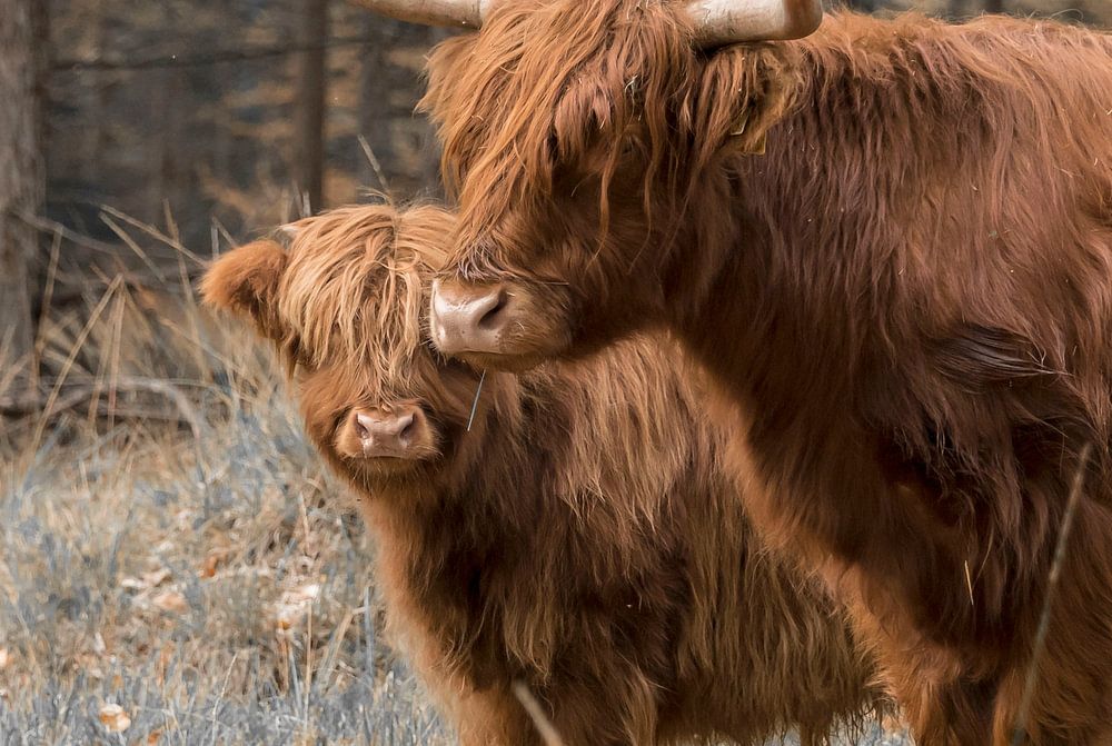 Highlander écossais avec veau, en automne, dans la réserve naturelle "De Stippelberg" à De Rips dans la province du Noord-Brabant aux Pays-Bas.