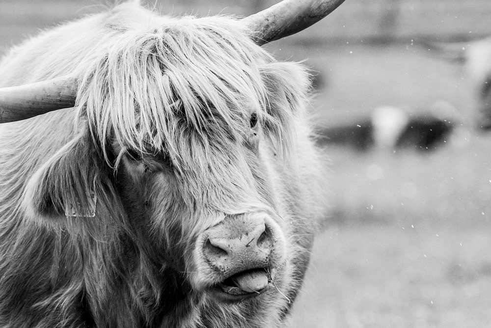 Portrait en noir et blanc d'un Highlander écossais tirant la langue et inclinant la tête. Ce portrait a été réalisé dans une prairie en Autriche.