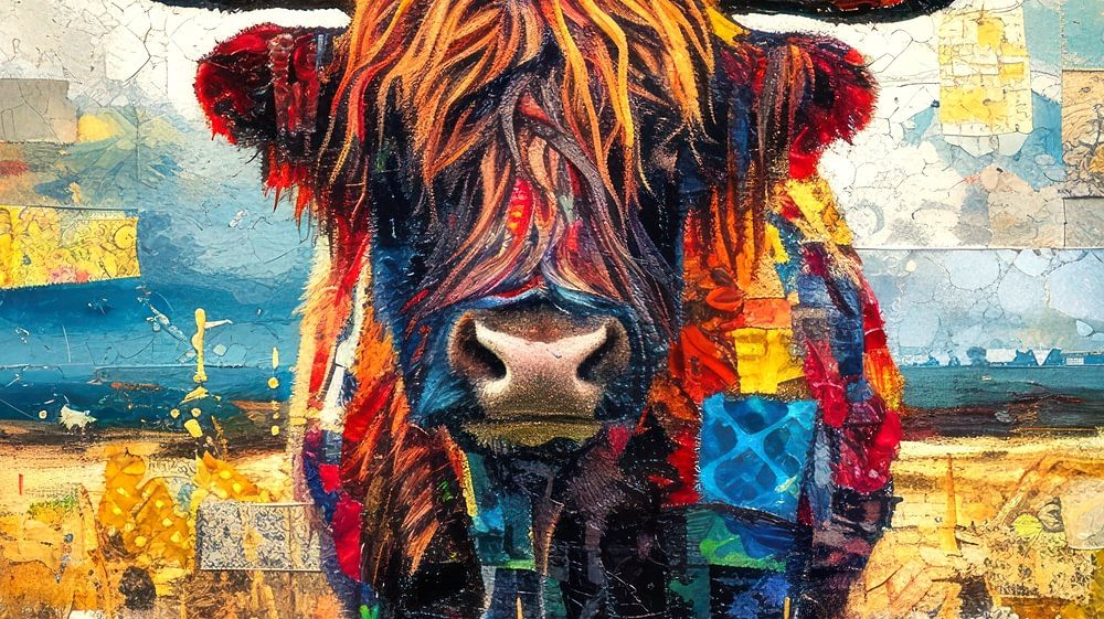 Un impressionnant Highlander écossais. Une présence puissante sur un fond vibrant et coloré qui capture l'essence d'un paysage.