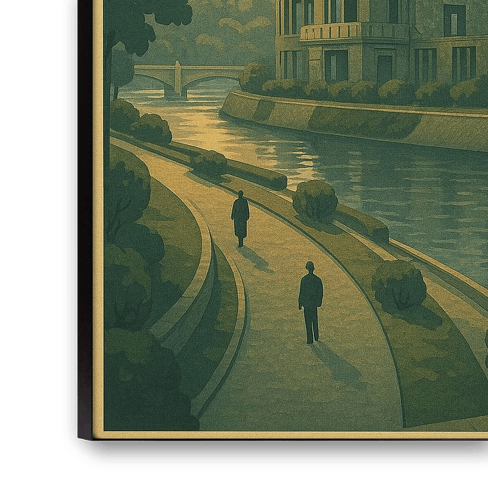 Ce poster serein sur l'harmonie d'Hiroshima capture la beauté tranquille et la profondeur émotionnelle de l'un des paysages culturels les plus significatifs du Japon. Illustrée dans un style chaleureux inspiré de l'Art déco, l'œuvre présente une scène lumineuse au bord d'une rivière, avec une pagode traditionnelle s'élevant élégamment au-dessus de collines verdoyantes. En contrebas, un pont rouge arqué traverse une eau calme et réfléchissante, guidant le spectateur au cœur de l'esprit paisible d'Hiroshima.