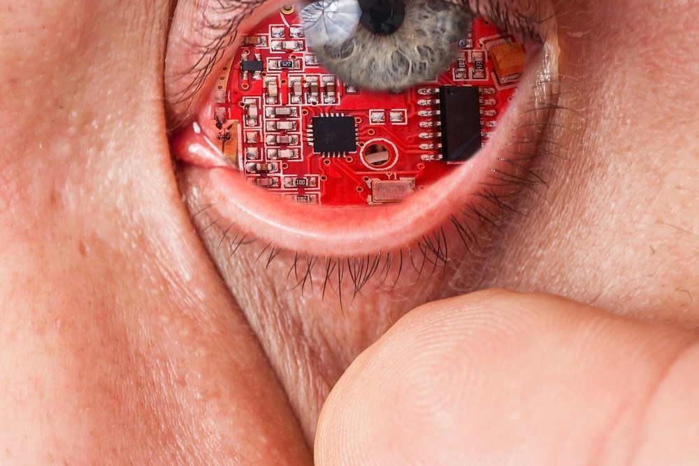 Homme avec une platine dans l'œil, symbolise la fusion de l'homme et de la machine.
