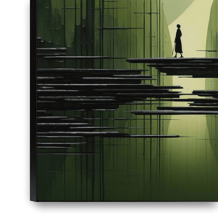 Cette peinture explore les frontières de la modernité avec ses horizons vert olive qui captent l'imagination. Les lignes épurées et les formes géométriques suggèrent un paysage urbain, tandis que le vert profond apporte un sentiment de calme et de sérénité. Le jeu d'ombre et de lumière crée un effet dynamique qui donne vie à l'œuvre et…