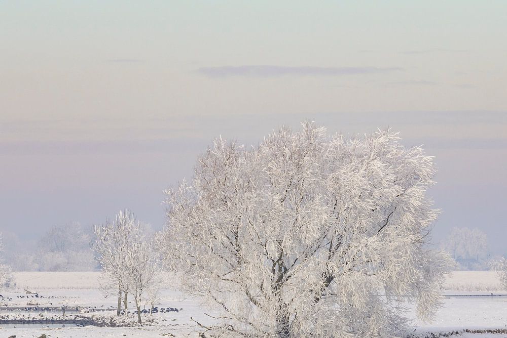 Horizontal de fleuve d'hiver de Milou au fleuve IJssel dans Overijssel, Pays Bas, avec un beau ciel pendant un matin froid d'hiver. Le ciel est doucement coloré avec les couleurs en pastel de bleu, oranges et pourpres.