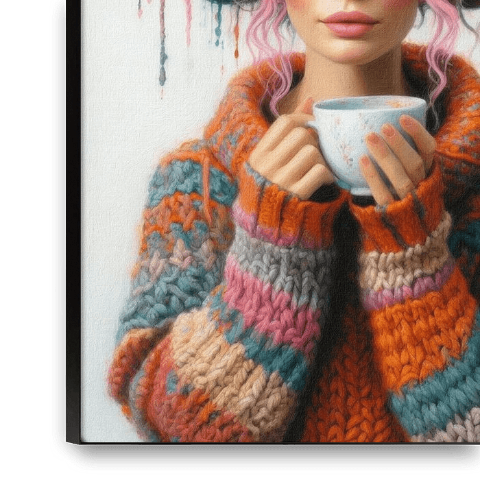 Un portrait coloré et amusant d'une jeune femme colorée et amusante, avec un bon conseil pour rester au chaud quand il fait froid : du thé chaud, un gros pull tricoté soi-même... et les restes de laine dans les cheveux !