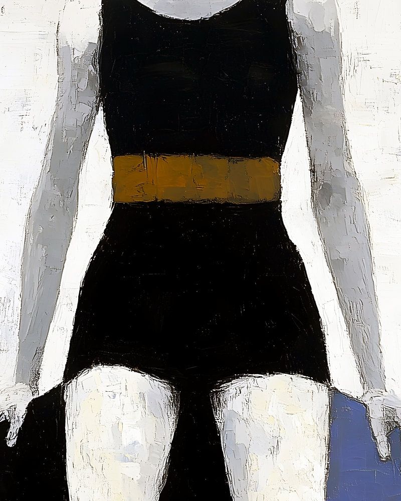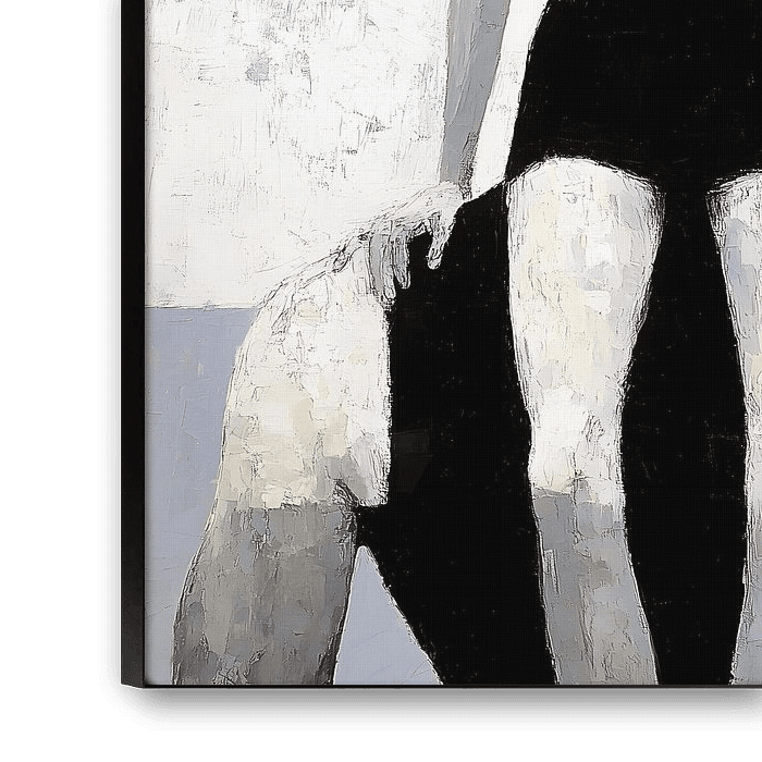 Cette œuvre d'art saisissante présente une exploration poignante de la forme et du contraste, avec une figure qui semble sûre d'elle. La palette monochrome, ponctuée d'une bande jaune frappante, souligne la présence du sujet sur un fond de tons sourds. L'interaction entre la figure debout et la figure assise évoque un sentiment d'équilibre et de tension, invitant à la contemplation sur les thèmes du soutien et de l'individualité. Incarnant une vision artistique unique, cette œuvre est un ajout attrayant à tout espace, où elle peut inspirer le dialogue et la réflexion.