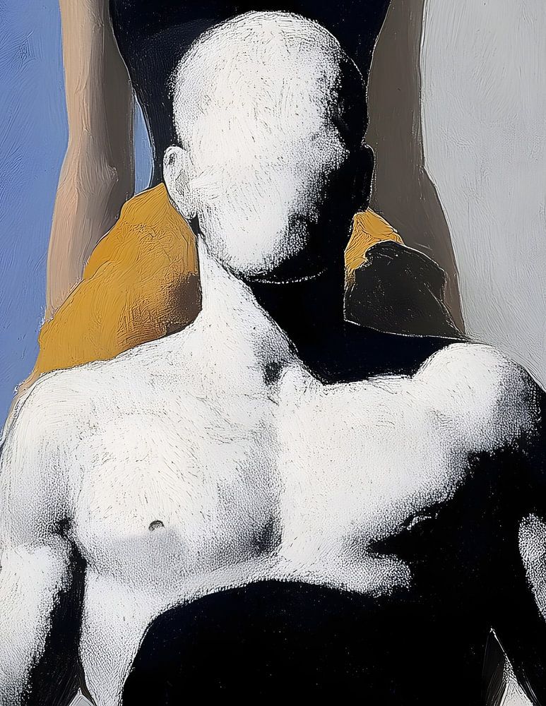 Entrez dans un monde où l'abstraction et la forme humaine se rejoignent dans cette œuvre d'art contemporain saisissante. Cette œuvre combine magistralement des éléments figuratifs et abstraits, avec une figure musclée sans visage au premier plan, et une seconde figure élégamment vêtue à l'arrière. Le jeu d'ombre et de lumière entre les corps crée un contraste saisissant, tandis que l'utilisation audacieuse de blocs géométriques et de zones de couleurs sourdes ajoute une touche moderne et architecturale.