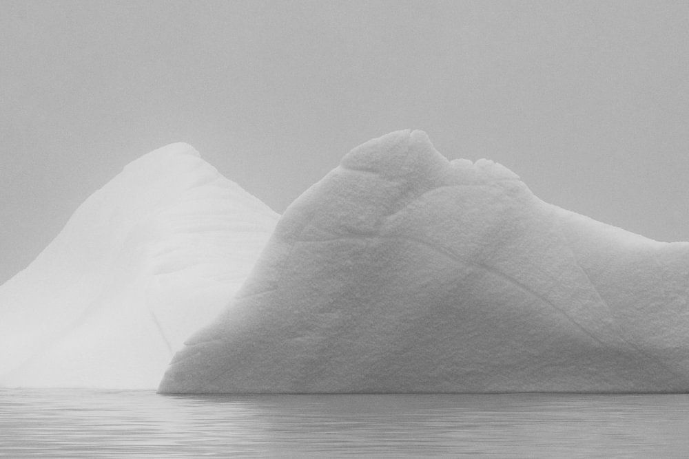 Deux icebergs se détachent sur l'eau grise et plate de la baie de Disko, au Groenland.