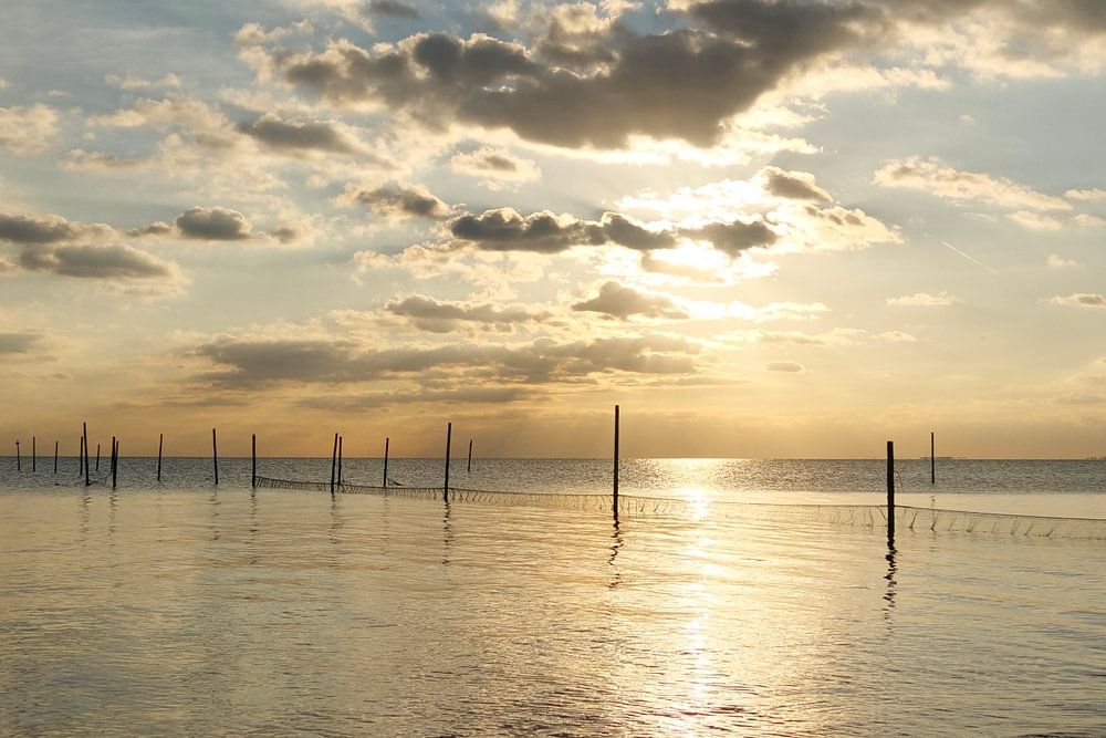 Coucher de soleil sur l'IJsselmeer avec des mésanges. À gauche, les vasières de marquage sont encore visibles, à droite, la côte de la Hollande du Nord.