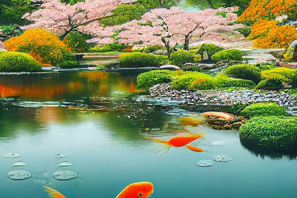 Illustration d'un étang de jardin japonais avec des poissons rouges