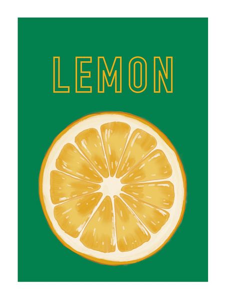 Achetez cette œuvre d'art Popart Illustration d'une tranche de citron montrant les tranches juteuses sur un fond vert contrasté, idéal pour la cuisine. par UMA Digital NL sur toile, aluminium, ArtFrame ou photographie (encadrée), impression d'art en haute qualité et tout format.