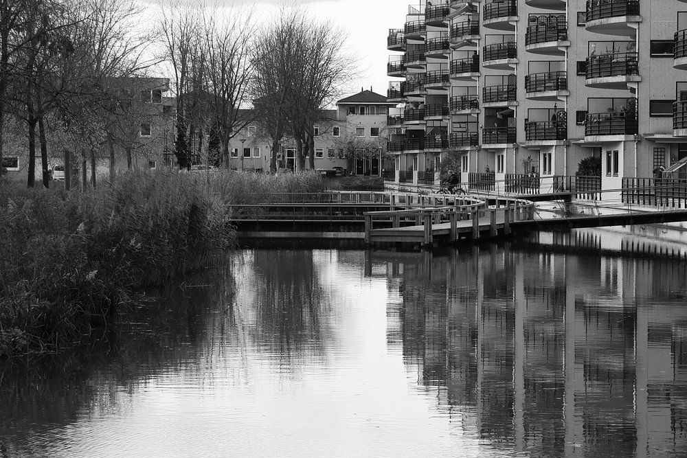 Sur le côté, on aperçoit un petit immeuble d'habitation, imposant et sévère, avec ses lignes droites et son design épuré. Le contraste entre la tranquillité et l'architecture urbaine chargée raconte une histoire d'équilibre. L'homme et la nature, l'ennemi et l'ami. Cette photo aurait pu être en couleur, mais c'est en noir et blanc qu'elle est le mieux présentée.