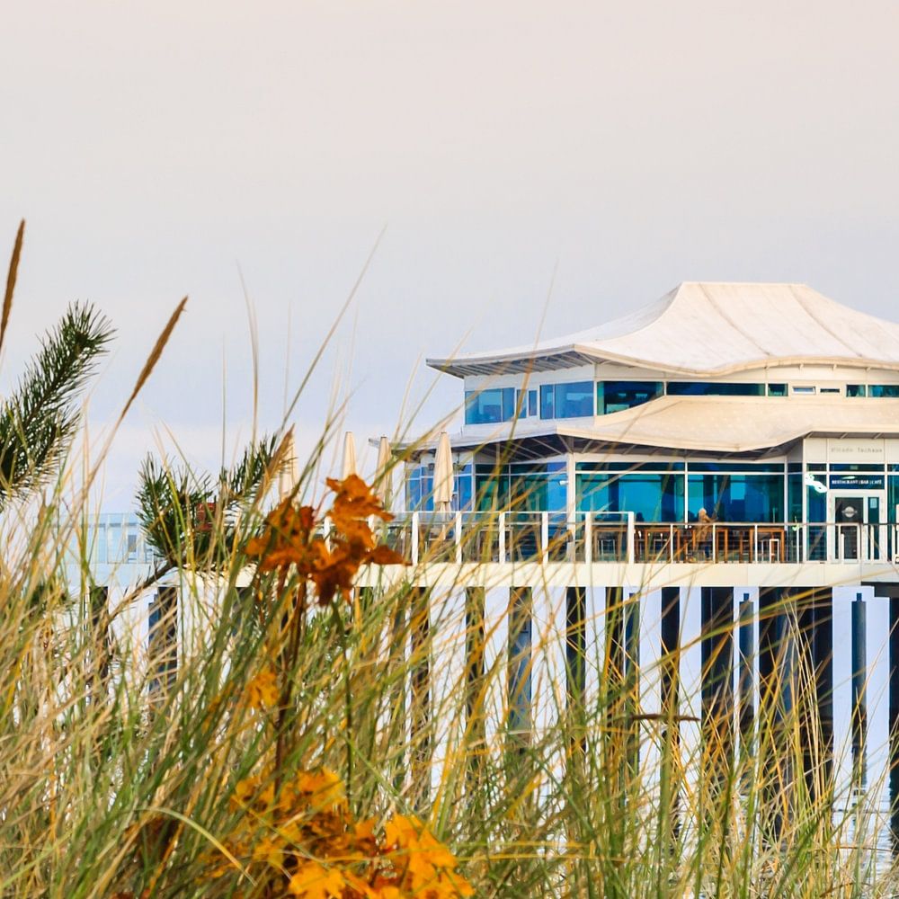 Impression d'automne enchanteresse avec une maison de thé exotique et orientale sur la côte de la mer Baltique.