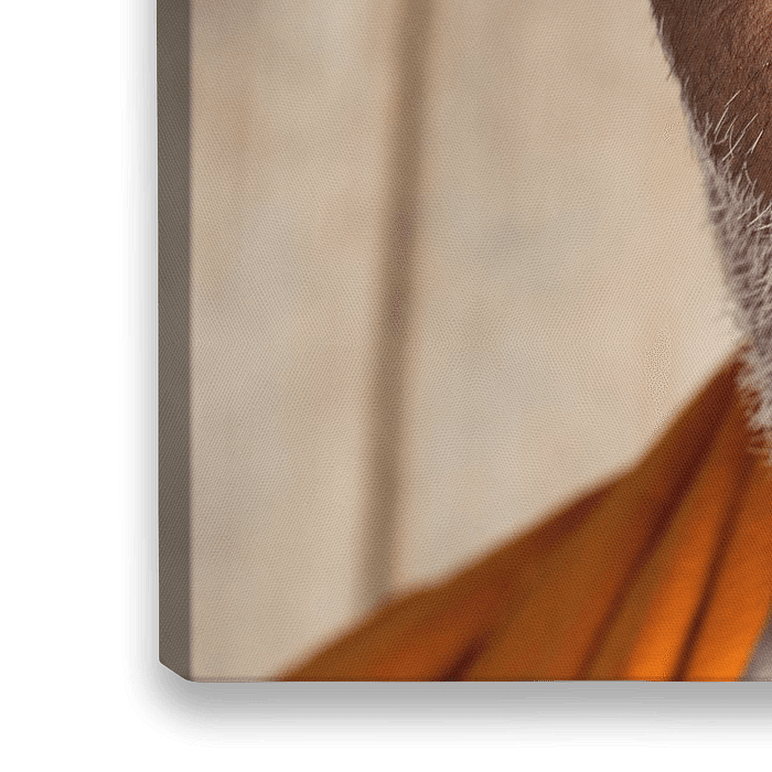 Cette image représente un Indien portant un turban et une robe orange vif. L'arrière-plan semble être une surface en bois avec des planches verticales. La couleur vive du turban et de la robe contraste avec les tons sourds du fond en bois, ce qui fait ressortir le vêtement. Cette image est intéressante en raison du contraste frappant…