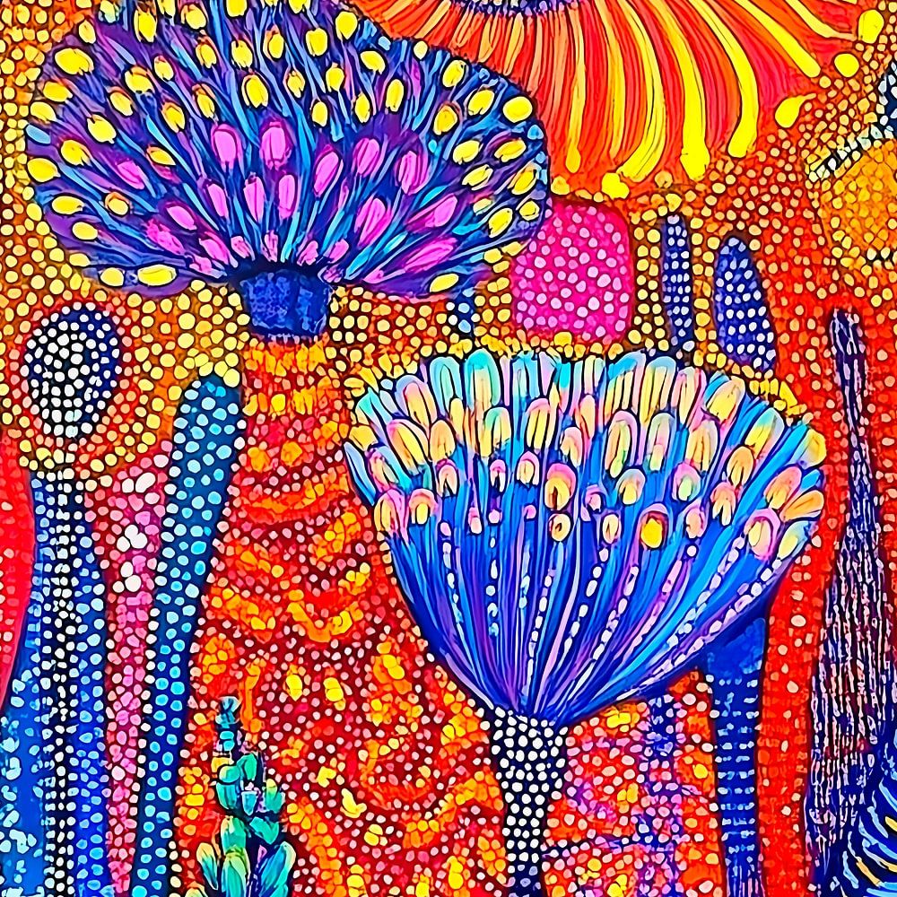 Une œuvre d'art vibrante et colorée représentant le feuillage de la brousse australienne dans le style de l'art des points avec des couleurs vives. L'arrière-plan est rempli de motifs tourbillonnants issus de l'art aborigène traditionnel, créant un effet enchanteur. Cette œuvre d'art capture l'essence de la beauté de la nature grâce à l'utilisation audacieuse de couleurs et de détails complexes.