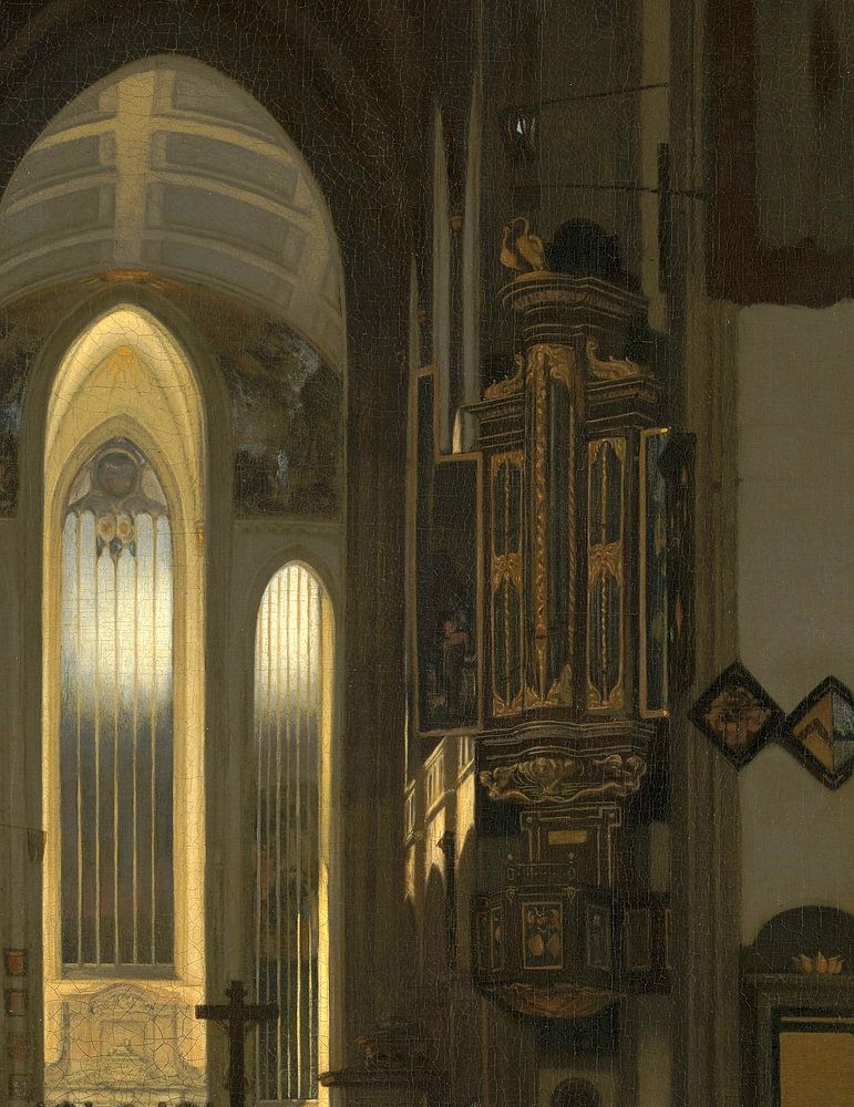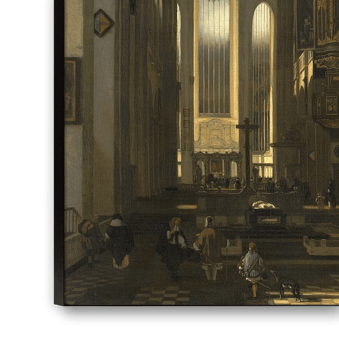 De Witte a peint plusieurs intérieurs d'églises d'ambiance, tous imaginaires. Ici, il montre une église gothique, avec des arcs pointus hauts et étroits. La lumière éclaire quelques personnages au premier plan, tandis que le reste de l'église est plongé dans l'obscurité.