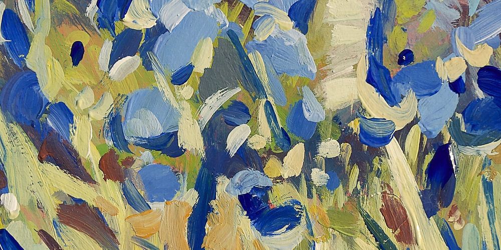 Des iris bleus, peints dans un petit jardin au coin de la rue. Très local, très petit mais avec un bel impact. Un beau travail en grand format. Magnifique pour au-dessus du canapé, du lit ou de la table à manger.