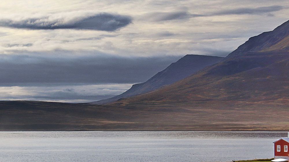 paysage en Islande avec maison rouge sur l'eau au premier plan