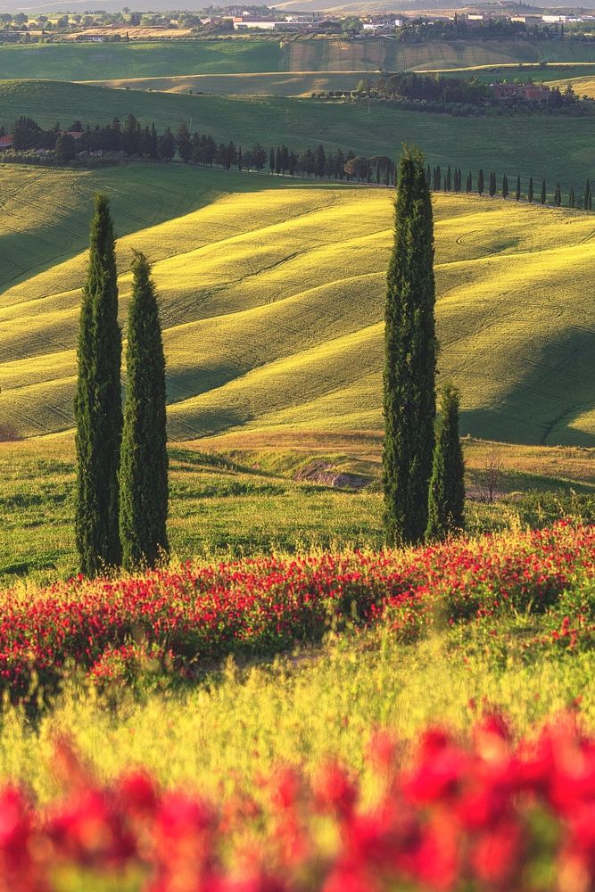 Une magnifique allée de cyprès s'étend le long de douces collines en Toscane. Les majestueux cyprès se dressent en parfaite symétrie et guident le regard vers le lointain. Au premier plan, des fleurs d'un rouge vif s'épanouissent et forment un contraste vivant avec le vert des arbres. La douce colline à l'arrière-plan complète ce tableau idyllique, éclairé par le chaud soleil doré de la Toscane. Cette scène transmet un sentiment de calme et de nature harmonieuse, typique des paysages pittoresques d'Italie.