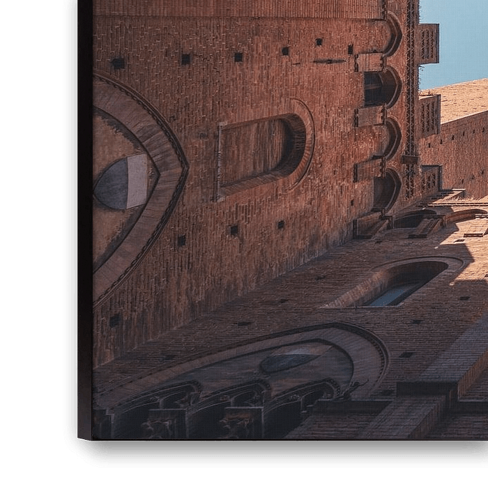 Vue impressionnante du Campanile (clocher) de Sienne, en Toscane, depuis la perspective d'en bas. L'architecture détaillée de la tour médiévale s'élève majestueusement vers le ciel, entourée de l'atmosphère unique de la ville historique. La perspective souligne la hauteur et l'élégance de l'édifice et invite à l'émerveillement.