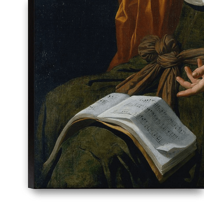 Cette fille est assise joyeusement avec ses partitions, avec des portées sur ses genoux. C'est un bon exemple des décors de bas-fonds préférés de Bijlert avec une superposition allégorique ou moralisatrice, qui déguise l'érotisme du XVIIe siècle en une personnification de la musique. La femme est de mœurs légères ou prostituée : son…