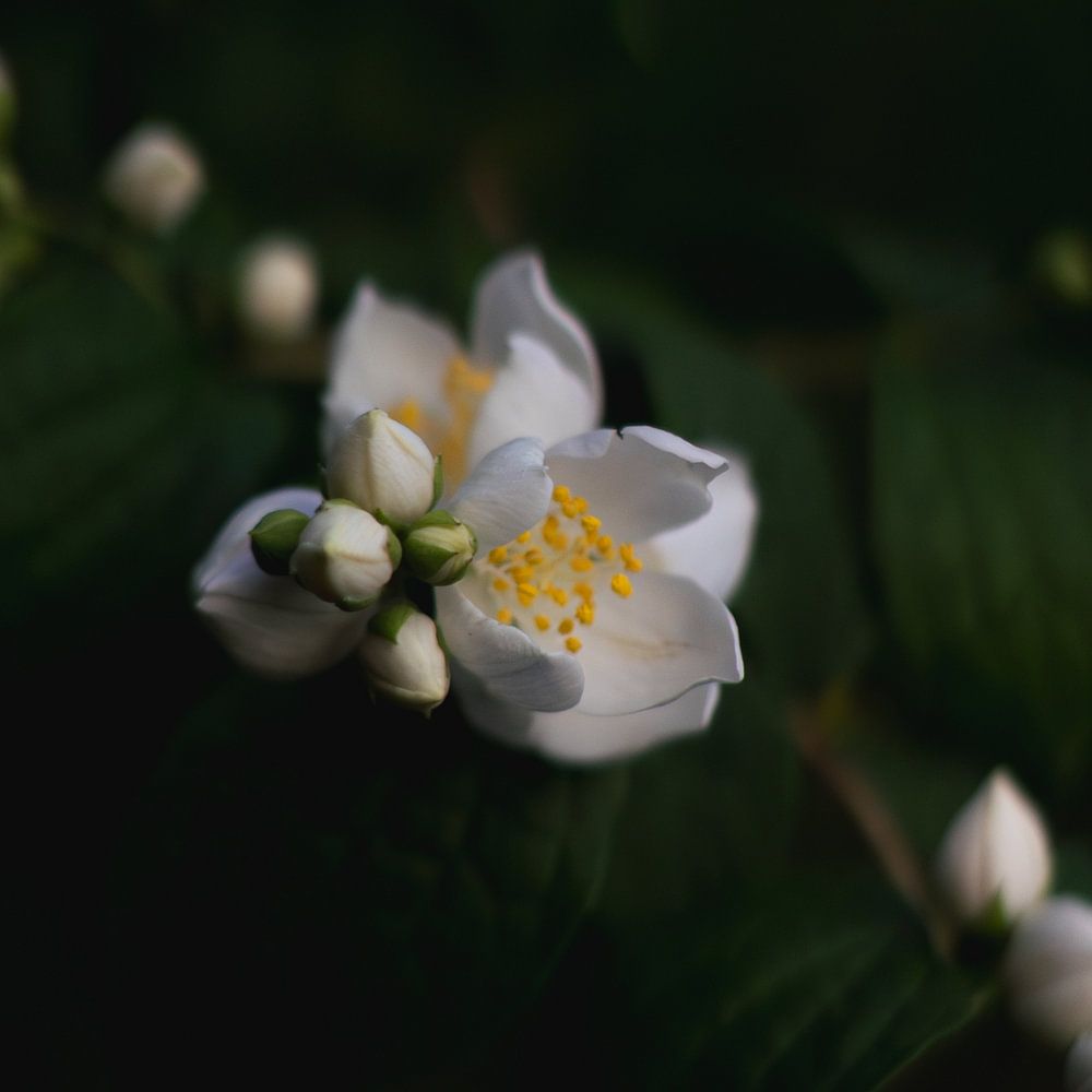 Une fleur de jasmin ouverte entourée de bourgeons en attente. L'arrière-plan reste sombre et flou, ce qui donne l'impression que la fleur est détachée de son environnement. Ce qui est visible est juste suffisant : blanc, doux et lumineux contre le vert profond.