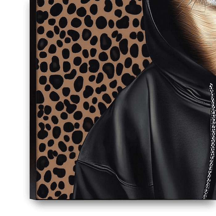 Cette image colorée montre un Chihuahua cool dans un style Pop Art vibrant, avec des couleurs imprimées léopard et un sweat à capuche noir cool. Les lunettes de soleil noires et l'expression sérieuse du chien exsudent l'ironie et l'humour, ce qui rend l'image instantanément souriante. Une décoration murale moderne qui s'intègre…