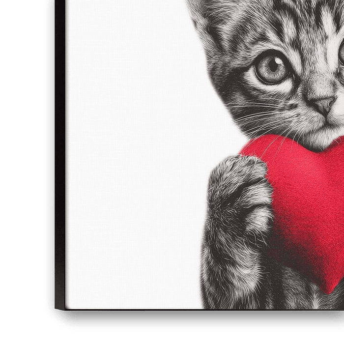 Si les mots ne suffisent pas, dites-le avec un chat ! Cet adorable chaton tient fermement un cœur rouge dans ses pattes et son regard est si attendrissant qu'aucun cœur ne reste insensible. Conçu de manière minimaliste, il met clairement l'accent sur l'expression et l'émotion. Un motif d'amour moderne, à la fois mignon et stylé. L'interaction entre le dessin fin en noir et blanc et le cœur rouge vif crée un contraste élégant qui rend le design intemporel et moderne. Que ce soit comme cadeau pour la Saint-Valentin, pour un anniversaire ou simplement pour dire "je t'aime" à quelqu'un, ce motif apportera beaucoup de cœur à ton intérieur.